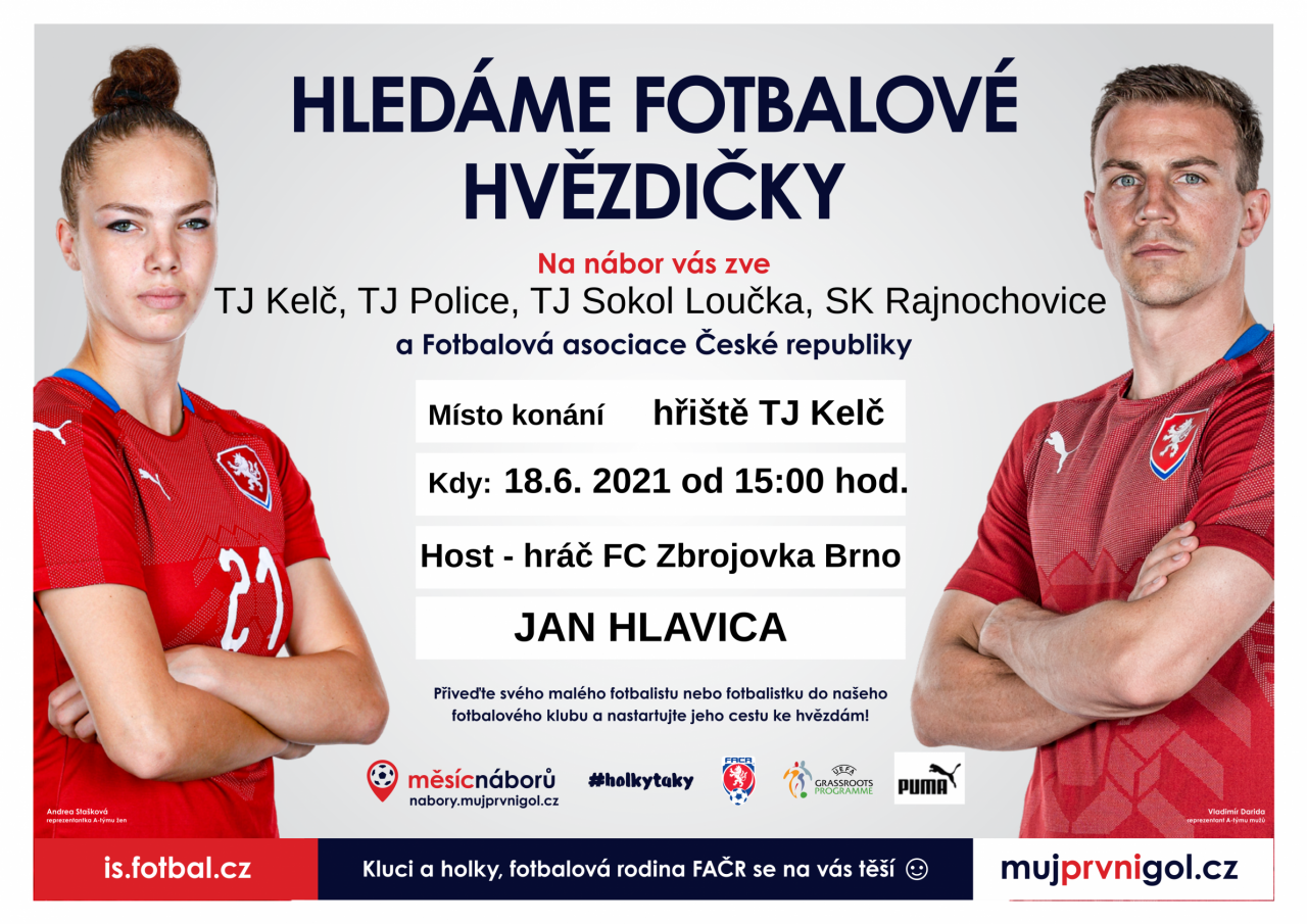 TJ Kelč, TJ Police, TJ Sokol Loučka, SK Rajnochovice a Fotbalová asociace České republiky vás zve na nábor, který se koná v pátek 18. 6. 2021 od 15:00 hodin na hřišti TJ Kelč. Hostem bude hráč FC Zbrojovka Brno - Jan Hlavica. Přiveďte svého malého fotbalistu nebo fotbalistku do našeho fotbalového klubu a nastartujte jeho cestu ke hvězdám!