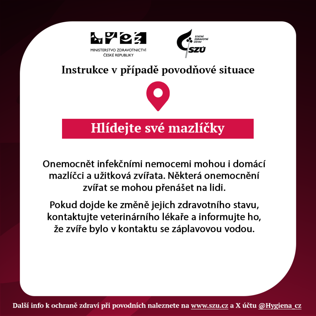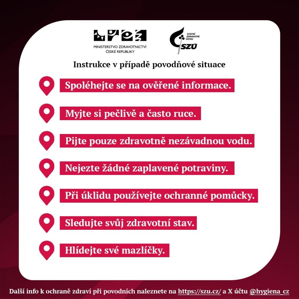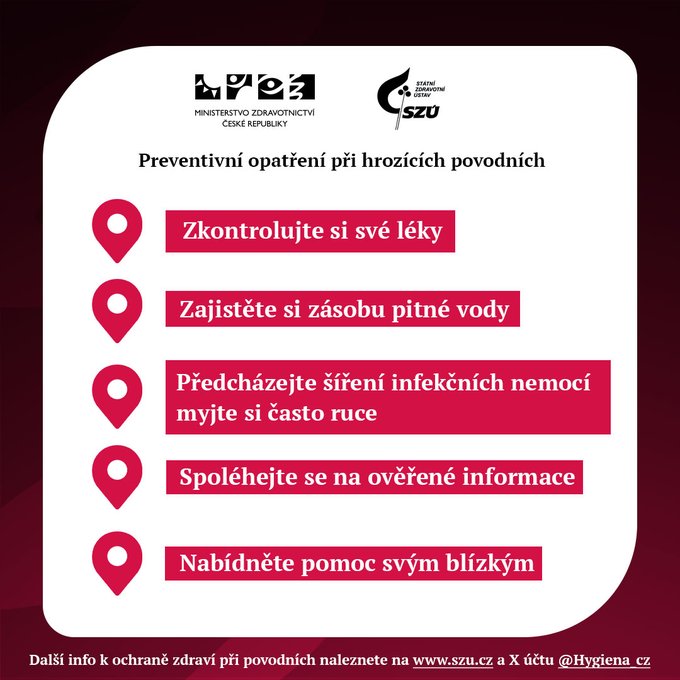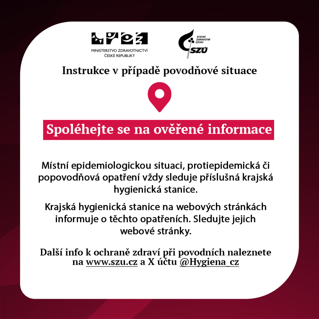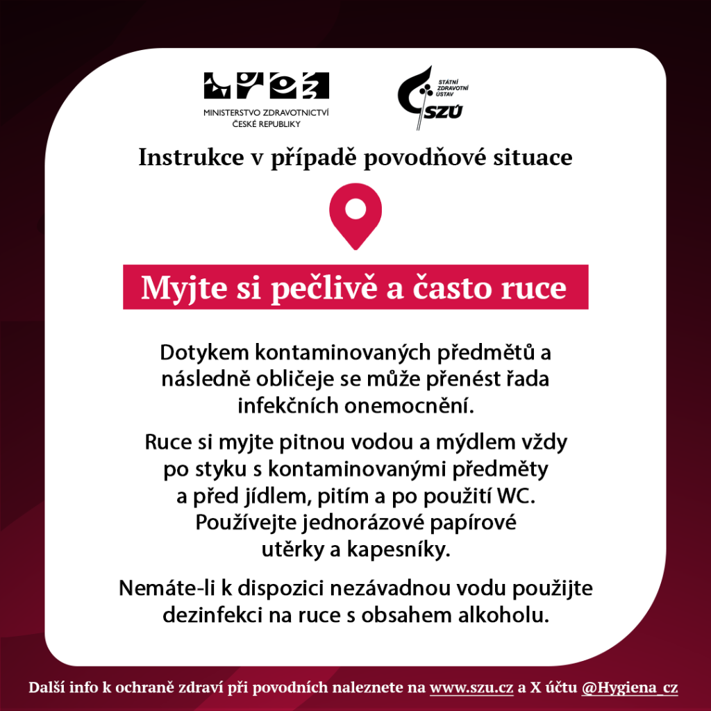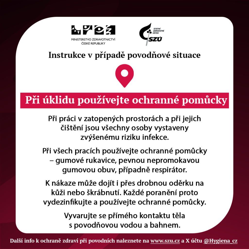 Další informace k ochraně zdraví při povodních naleznete na stránkách Ministerstva zdravotnictví (www.mzd.gov.cz) a Státního zdravotního ústavu (www.szu.cz) a na sociální síti X @Hygiena_cz.