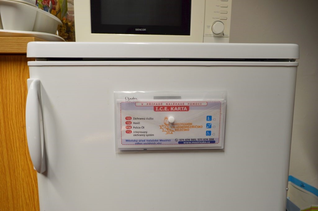 I.C.E. kartu přeložte na třetiny a vložte do plastové obálky tak, aby byla vidět třetina zadní strany s výrazným nápisem I.C.E. karta. Poté obálku připevněte na kovový povrch lednice.