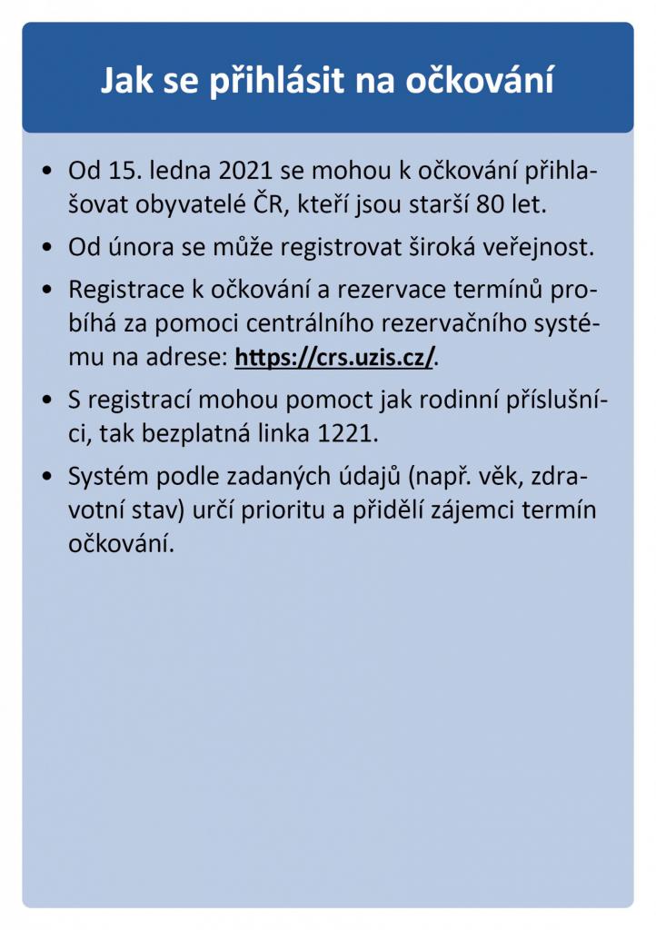 Od pátku 15. 1. 2021 se mohou senioři starší 80. let registrovat k očkování proti COVID-19. Registrace je možná na internetu v centrálním rezervačním systému na stránce crs.uzis.cz nebo telefonicky na bezplatné lince 1221.