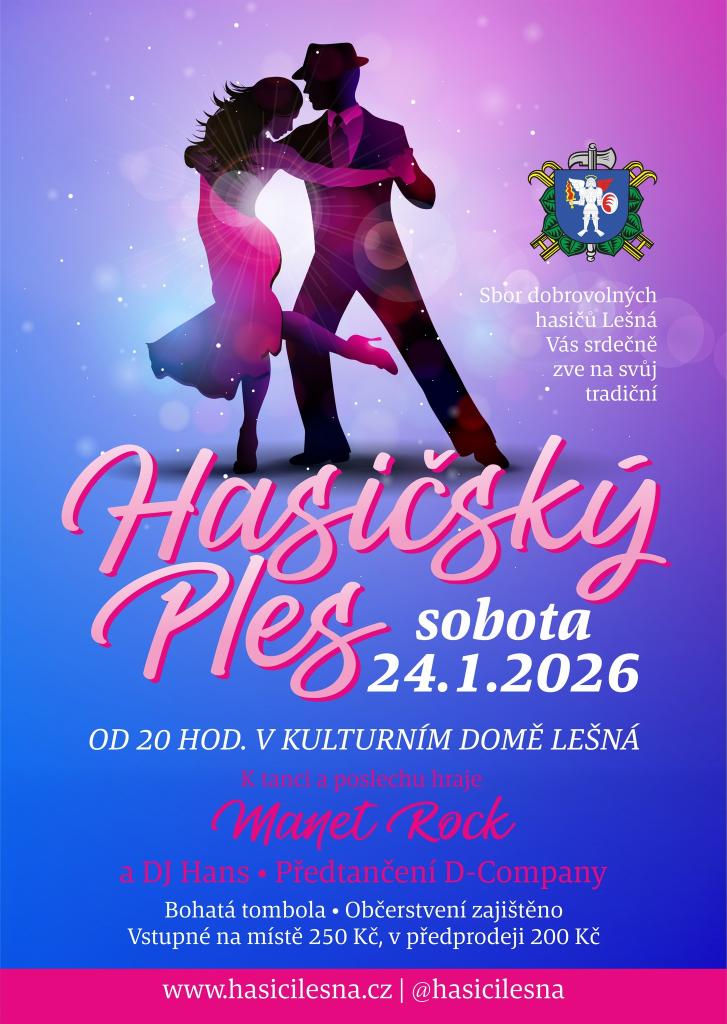 SDH Lešná Vás srdečně zve na tradiční hasičský ples, který se koná v sobotu 24.1.2026 v Kulturním domě v Lešné od 20 hod. K tanci a poslechu zahraje skupina Manet Rock a DJ Hanz. Předprodej vstupenek a rezervace míst na tel. 732 200 318. Můžete těšit na bohatou tombolu a občerstvení.