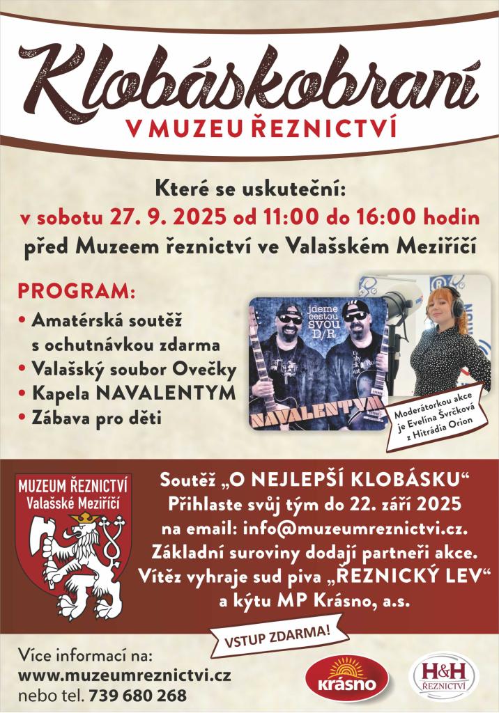 Rádi bychom i Vás pozvali na akci Klobáskobraní která se uskuteční 27. 9. 2025 od 11 hodin před Muzeem řeznictví ve Valašském Meziříčí. Program je opravdu bohatý, který potěší dospělé i děti. Bude zde probíhat amatérská soutěž " O nejlepší Klobásku", kde účastníci dostanou vše potřebné k výrobě klobásek a vítěz vyhraje sud Řeznického piva a kýtu. Do soutěže se mohou účastníci přihlásit do 22. září 2025 na email: info@muzeumreznictvi.cz nebo na telefonním čísle 739 680 268.