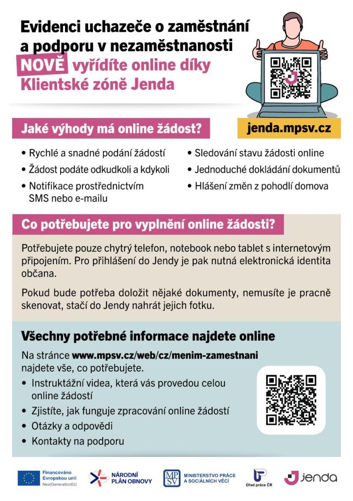Klientská zóna Jenda přináší inovativní řešení pro uchazeče o zaměstnání a osoby žádající o podporu v nezaměstnanosti. Tento online systém umožňuje rychlé a pohodlné podání žádosti odkudkoli a kdykoli pomocí chytrého telefonu, notebooku nebo tabletu s internetovým připojením. Pro přihlášení je nutná elektronická identita občana. Mezi hlavní výhody patří sledování stavu žádosti online, jednoduché dokládání dokumentů prostřednictvím fotografií a notifikace pomocí SMS nebo e-mailu. Všechny potřebné informace a instruktážní videa jsou dostupné na webu MPSV.