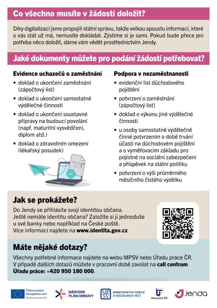 Klientská zóna Jenda umožňuje snadné podání žádostí o evidenci uchazeče o zaměstnání a podporu v nezaměstnanosti online. Využívá elektronickou identitu občana pro přihlášení a nabízí možnost sledování stavu žádosti a notifikace. Dokumenty lze jednoduše fotit a nahrávat, což zjednodušuje celý proces.